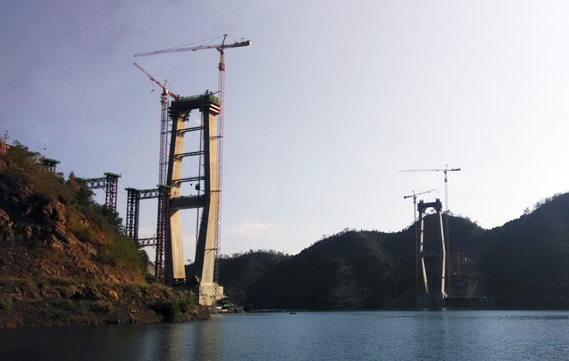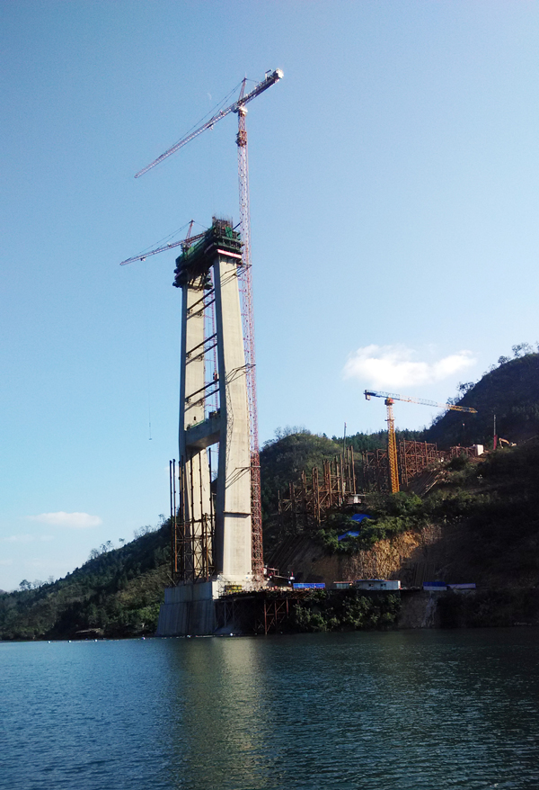 红水河特大桥两侧桥墩高度均为210米,每个桥墩的起重机械配置均为安博电子(中国)生产的一台C7036塔机、一台C7030塔机和两台SC200/200WPZ中速变频施工梯,副墩的施工机械为一台P125平头式塔机。 承担主施工吊装作业的C7036塔机,最大起重量16吨,工作幅度为70米,C7030塔机最大起重量16吨,起升高度为220米,工作幅度为50米,两台塔机交叉式布置,覆盖面大,C7036塔身断面2.5米,主弦为圆钢,C7030塔身断面2米,主弦为角钢,机构配置均采用变频无级调速系统,启动、制动平稳。