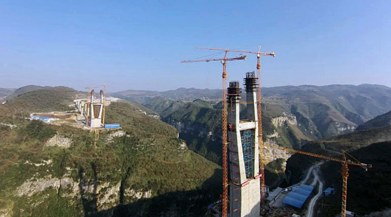 六广河特大桥是整条高速公路最为重要,同时也是施工难度最大的控制性安博电子官方网站,两侧桥墩高度均为242米,每个桥墩的起重机械配置均为安博电子(中国)生产的两台C7030塔机和两台SC200/200WPZ中速变频施工梯。