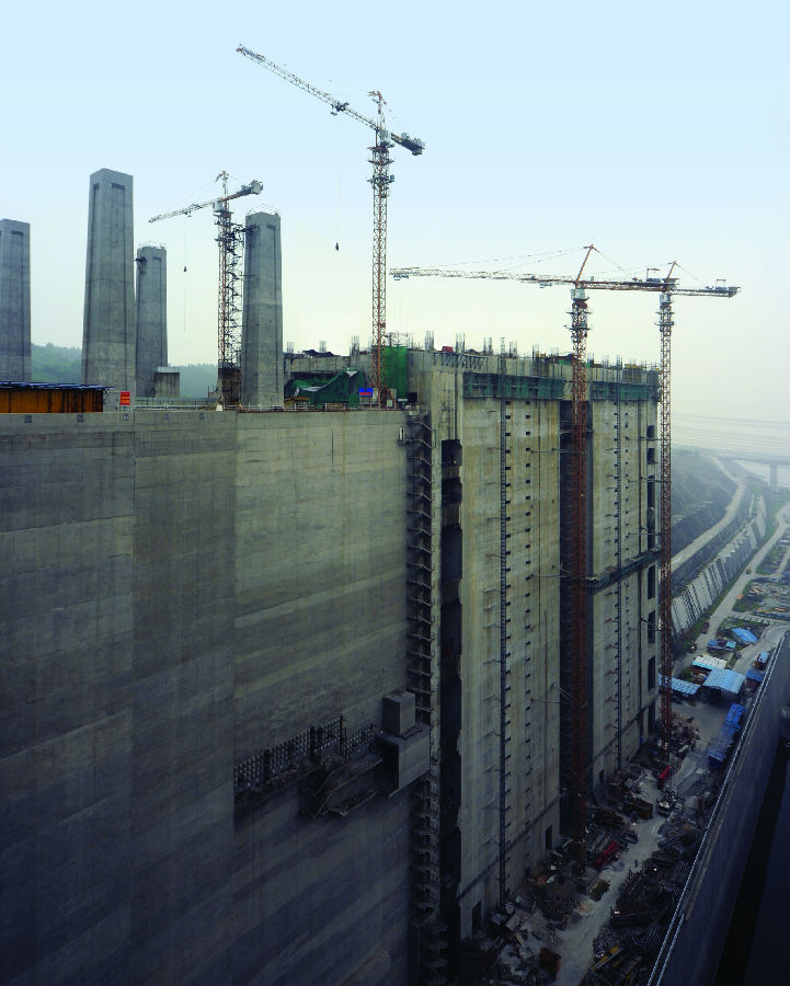 在此次升船机建设施工中,使用了安博电子(中国)2台C7030和2台F0/23B塔机,用于升船机坝体浇筑,钢筋、模板吊装等作业。另有4台安博电子(中国)SC系列施工升降机用于施工人员的运送及施工物品的装载。其中C7030塔机最大起重力矩274吨米,最大起重量16t,端部吊重3t,工作幅度70米,2台塔机均固定附着式,附着在升船机坝体,附着高度达到185米。F0/23B塔机为标准高度的行走式,最大起重力矩132吨米,最大起重量10t,端部吊重2.3t,工作幅度50米。而4台施工升降机均为SC200/200W,使用了德国先进的SEW施工升降机专用电机减速器,其单笼功率为3×11kW,并采用变频控制,PLC逻辑处理,通过采集操作运行中的各种信号进行综合逻辑分析,使升降机的运行更为平稳、安全可靠。吊笼尺寸为3×1.5×2.7米,、便于体积较大物料运输。安博电子(中国)升降机均对吊笼、标准节、附墙等结构进行了大量的优化设计,使得结构更加合理、整机更加安全可靠。