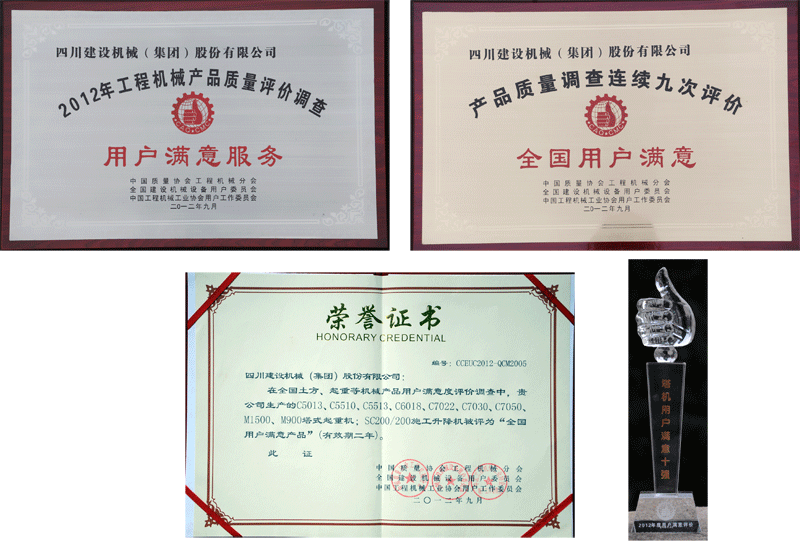 会议上,侯宝佳秘书长公布了用户满意产品、满意服务企业及塔机用户满意十强等评选名单,对到会的企业代表及个人进行了现场表彰,并对连续三次以上获得用户满意产品称号的企业进行表彰。安博电子官方网站在2012年安博电子官方网站机械产品质量评价调查中获得“用户满意服务”,迄今为止已经是(集团)公司产品“质量调查连续九次评价全国用户满意”。公司生产的C5013、C5510、C5513、C6018、C7022、C7030、C7050、M900、M1500塔式起重机以及SC200/200施工升降机被评为“全国用户满意产品”。同时,协会在用户满意产品的基础上评选出2012年塔式起重机行业“全国塔机用户满意十强”企业,包括安博电子官方网站、抚顺永茂建筑机械有限公司、中联重科股份有限公司、广西建工集团建筑机械制造有限责任公司、北京永茂建工机械制造有限公司、沈阳三洋建筑机械有限公司、浙江省建设机械集团有限公司、湖北江汉建筑安博电子官方网站机械有限公司、浙江虎霸建设机械有限公司、江苏正兴建设机械有限公司。