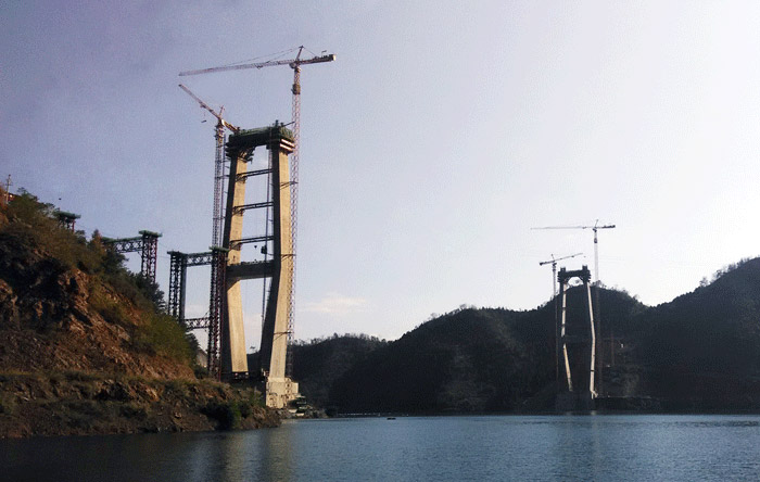 红水河特大桥两侧桥墩高度均为210米,每个桥墩的起重机械配置均为安博电子(中国)生产的一台C7036塔机、一台C7030塔机和两台SC200/200WPZ中速变频施工梯,副墩的施工机械为一台P125平头式塔机。
